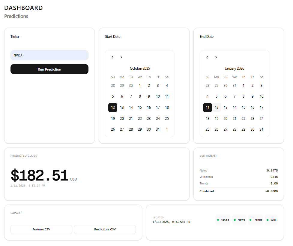Real-time data fetching from Yahoo Finance, Google News RSS, Google Trends API, and Wikipedia pageviews. No stale datasets.
